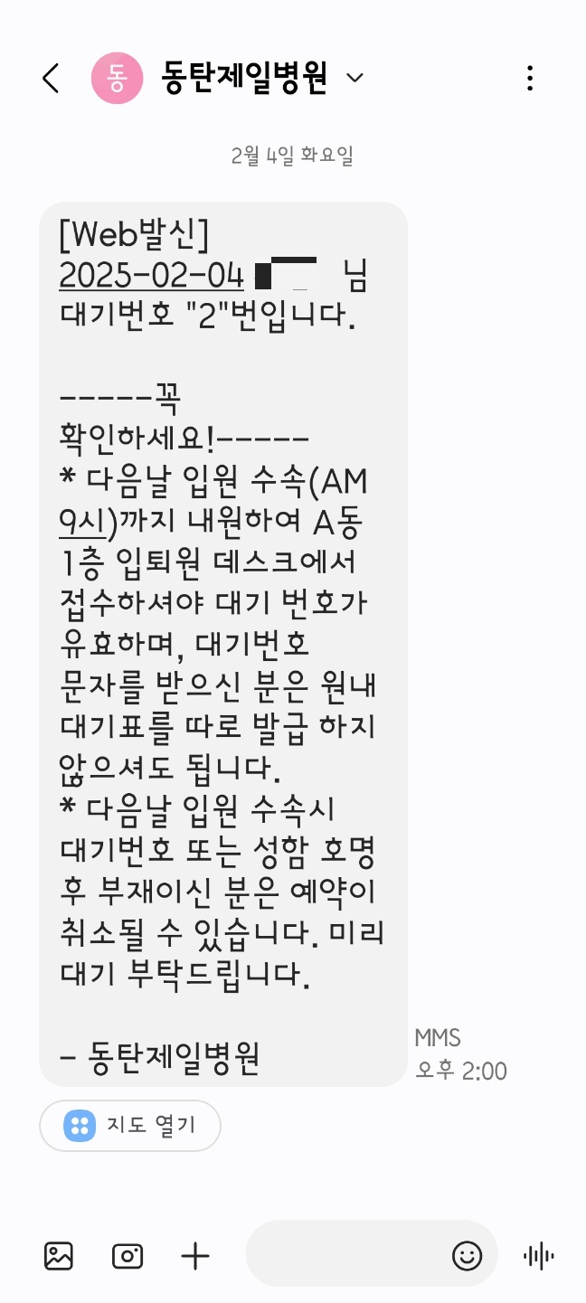 오후 1시 55분부터 동제 홈페이지에서 입원 수속 대기 셋팅을 해놓고 (회원가입, 로그인) 2시 땡되면 입원 수속을 진행한다. 그러면 하기와 같이 입원 대기 번호표가 발행된다. (혹시 오류 걸릴까봐 오빠랑 둘이 각 핸드폰으로 진행했는데, 난 오류가 나서 다음 페이지로 안넘어갔고!!! 오빠 폰으로 신청한게 대기 2번이 걸렸다. 매우 아찔 아찔쓰. 화면을 캡쳐해서 수술 당일날 9시에 입원 데스크에서 보여주면 된다.)